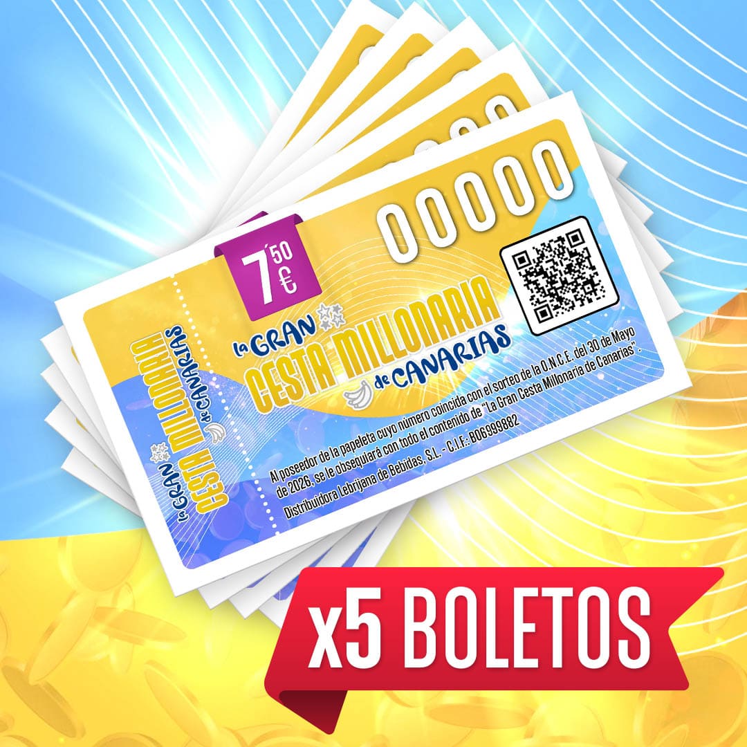 Este lote especial incluye 5 boletos con un descuento exclusivo para que tengas más posibilidades de ganar los increíbles premios que «La Gran Cesta Millonaria de Canarias» tiene preparados.